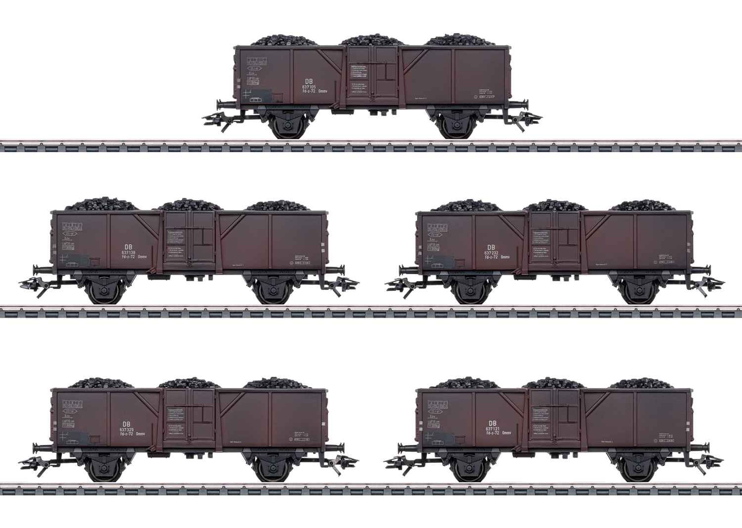 Vorbild: Mittenselbstentladewagen Fd-z-72 Ommv (späterer El-u 061).Fünf Mittenselbstentladewagen mit Steinkohlebeladung und betriebsgerechter Alterung, wie sie in den 1950er- und 1960er-Jahren des vorigen Jahrhunderts oft im Güternahverkehr zu sehen waren. Ihr Vorteil waren die schnelle und preisgünstige Entladung der Steinkohle beim Kleinempfänger.